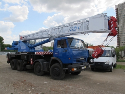 Аренда автокрана 32 тонны Галичанин КС 55729-1 собранного на базе шасси КамАЗ 6540 с приводом 8х4. Автомобильный кран с четырехсекционной телескопической стрелой и вылетом стрелы на 31 метр. При вылете стрелы на 3 метра максимальная грузоподъемность 32 тонны. Телескопическая стрела может быть оснащена решетчатым гуськом на 9 метров, это позволит увеличить рабочее пространство под стрелой. Работа крановой установки заключается в погрузке и разгрузке тяжеловесных строительных материалов, подъеме и спуске разных по тяжести грузов.