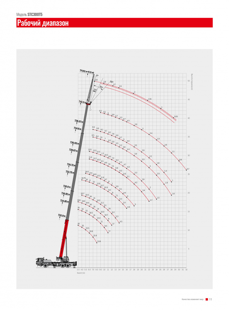 Дальность вылета стрелы: Sany STC300T5 имеет возможность максимального вылета стрелы, что позволяет обеспечить охват большой площади без перемещения крана.